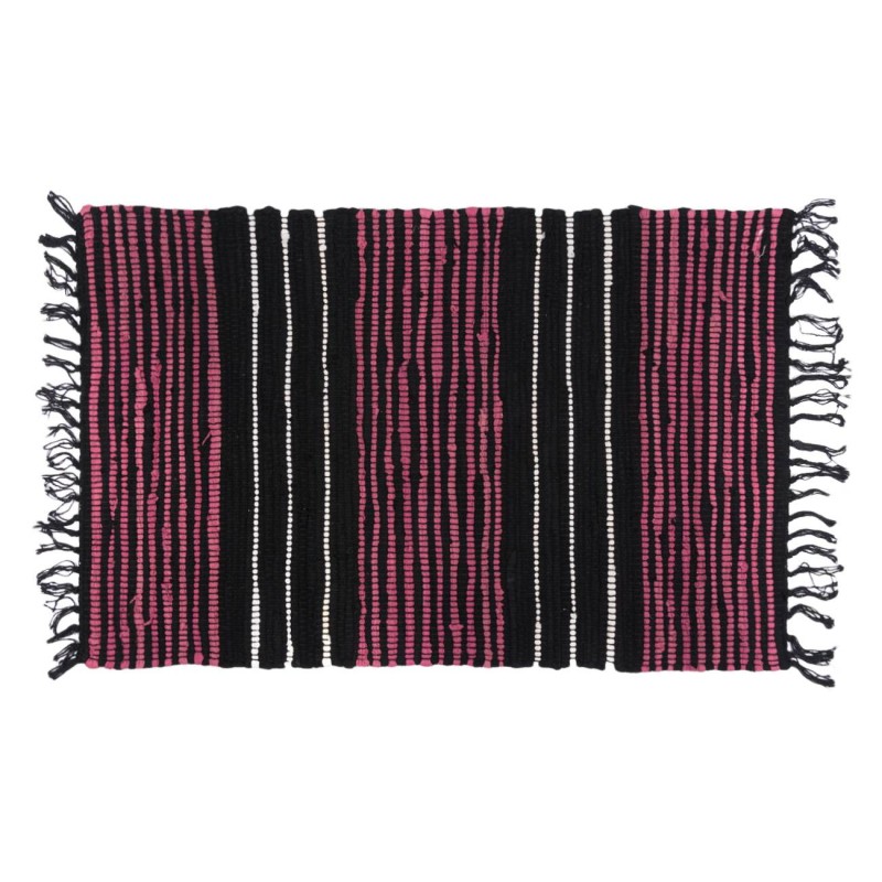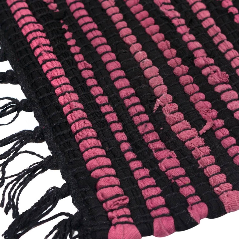 Постелка за под, изработена от памук с раирани шарки в черно и бордо и декоративни ресни от двете страни.