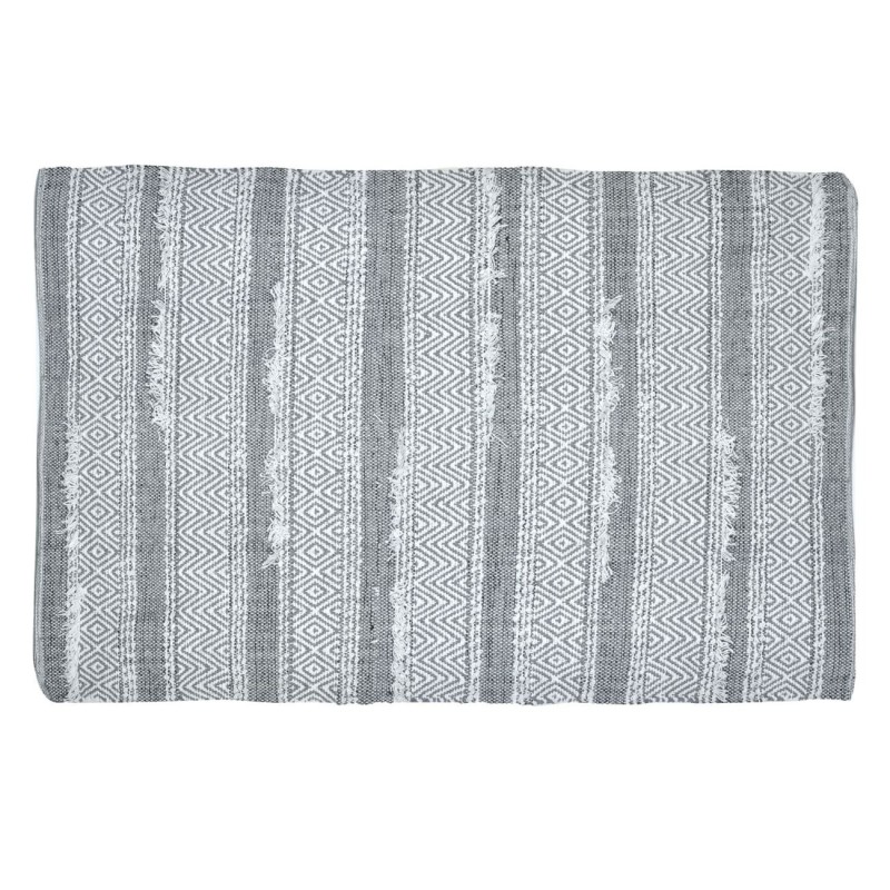 Постелка за под, изработена от мека и приятна материя със сиво райе и ромбоидни шарки.