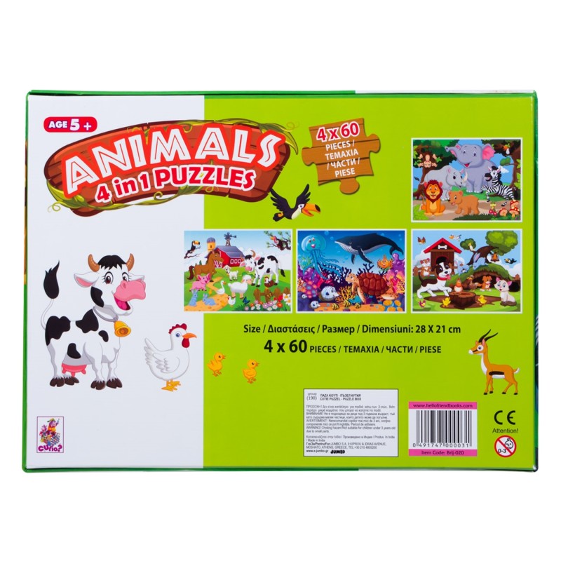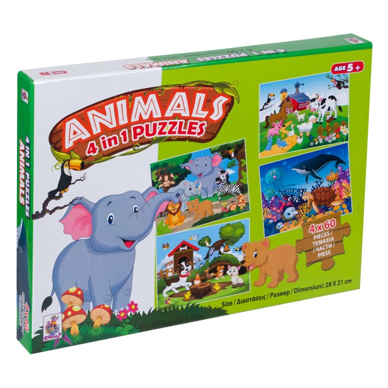 Детски комплект от 4 пъзела по 60 части с красиви цветни картинки на различни животни - от фермата, джунглата, домашни животни и морски обитатели.
