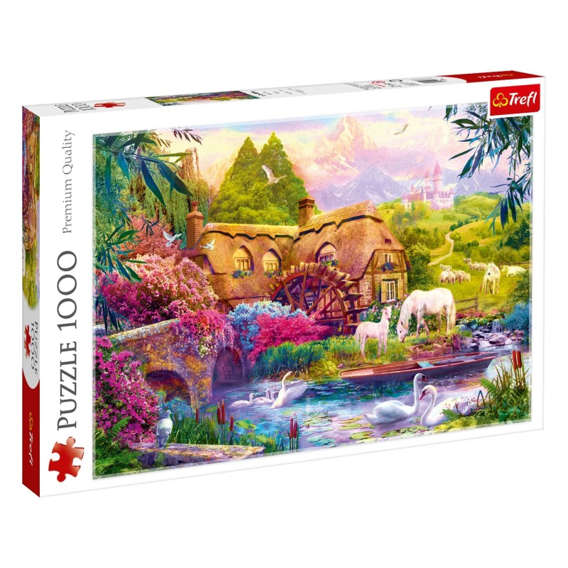 Голям пъзел от 1000 части с красив приказен пейзаж с къща, езеро, коне и лебеди.