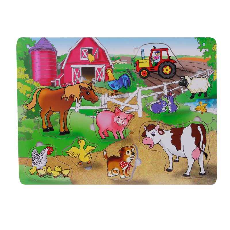 Детски образователен пъзел, изработен от дърво с 11 картинки, показващи различните животни, живеещи във фермата.