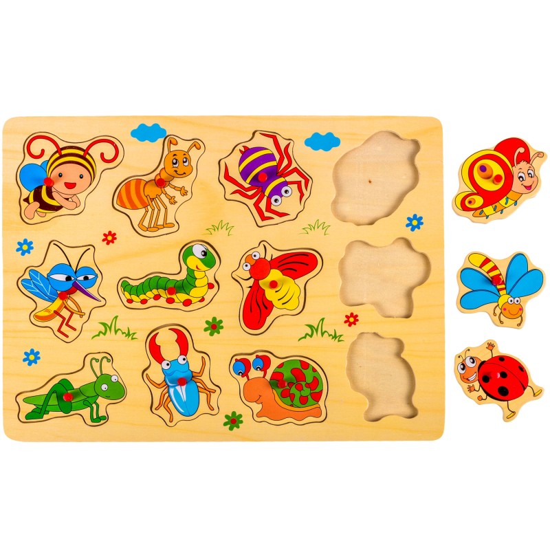 Детски образователен пъзел с 12 весели и забавни картинки на различни насекоми - пчела, мравка, паяк, пеперуда, комар, гъсеница, муха, водно конче, скакалец, бръмбар рогач, охлюв и калинка.