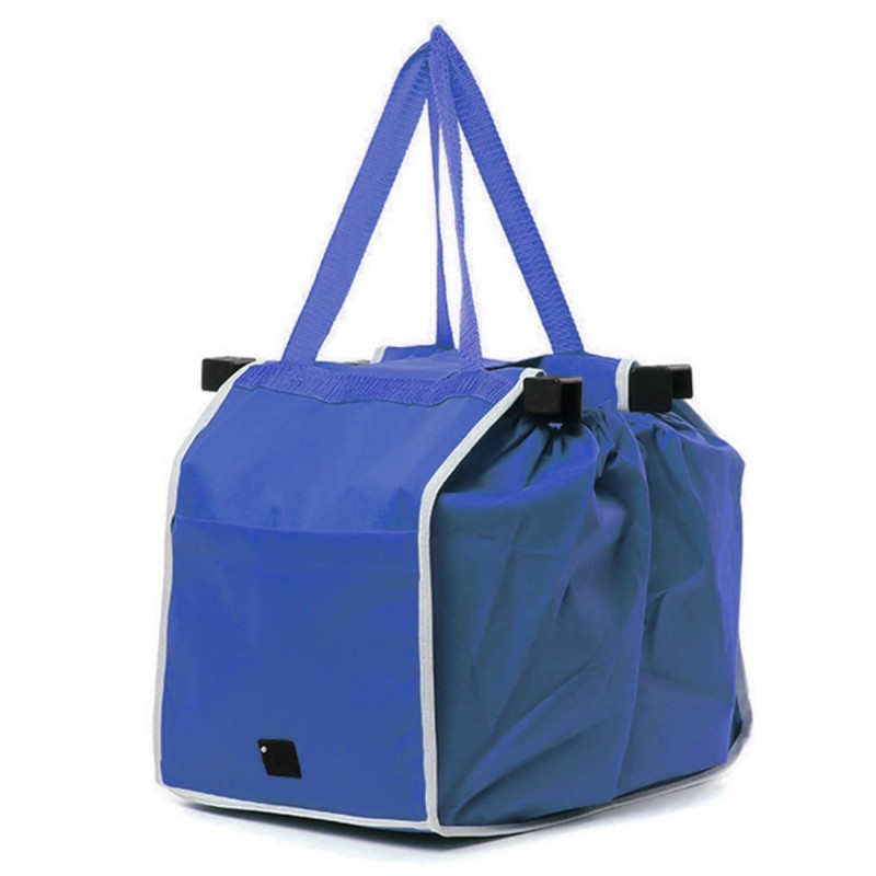 Пазарска термо чанта от плат в син цвят за многократна употреба, която лесно и стабилно се захваща за стените на всяка количка за пазаруване посредством 2 пластмасови държача.