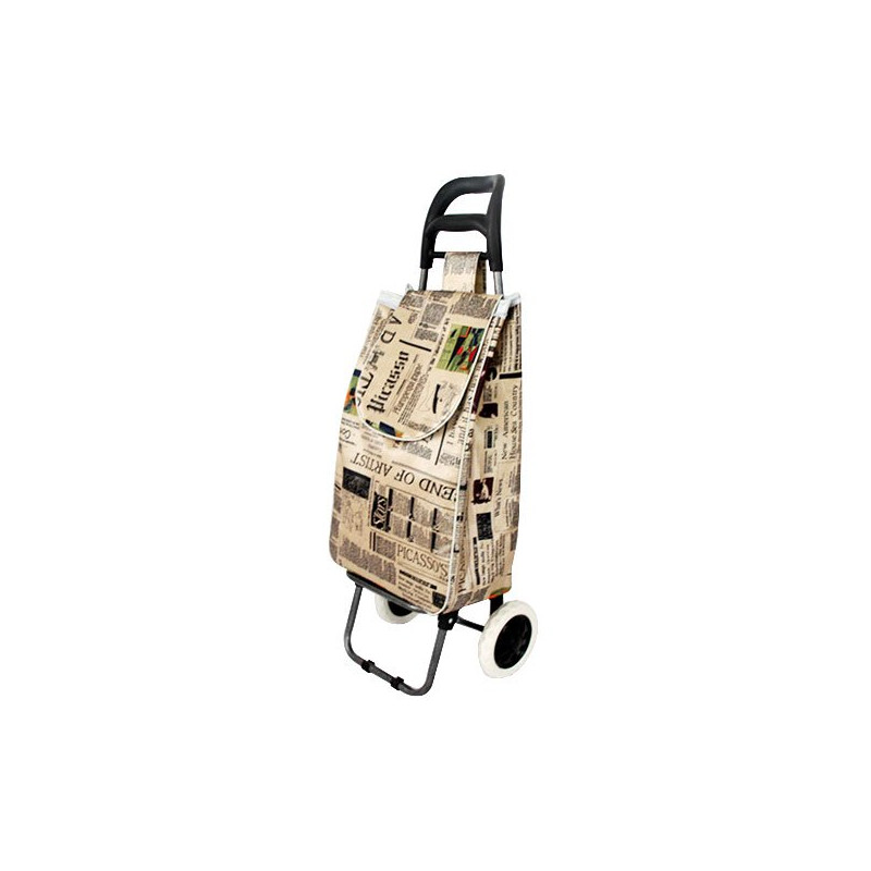 Пазарска чанта от плат във вестникарски принт със стойка и колелца за удобство при пазаруване.
