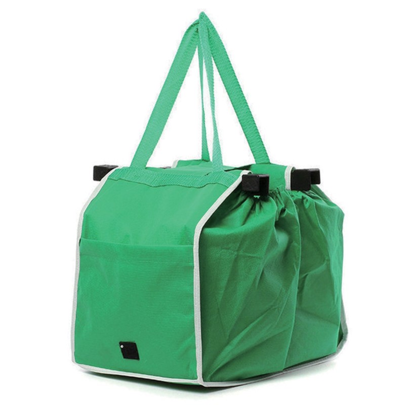 Пазарска чанта от плат в зелен цвят за многократна употреба, която лесно и стабилно се захваща за стените на всяка количка за пазаруване посредством 2 пластмасови държача.