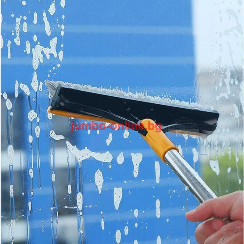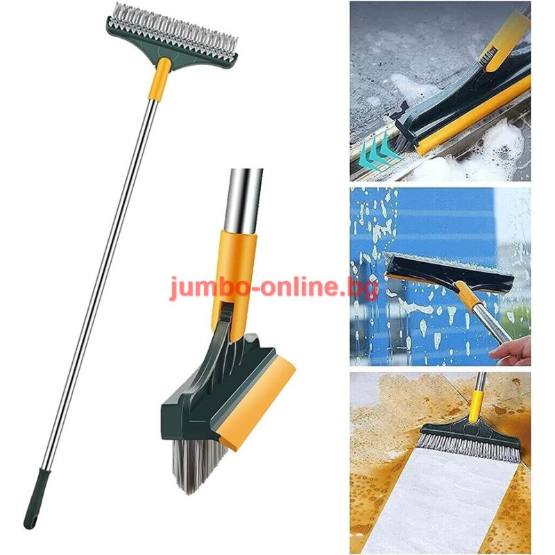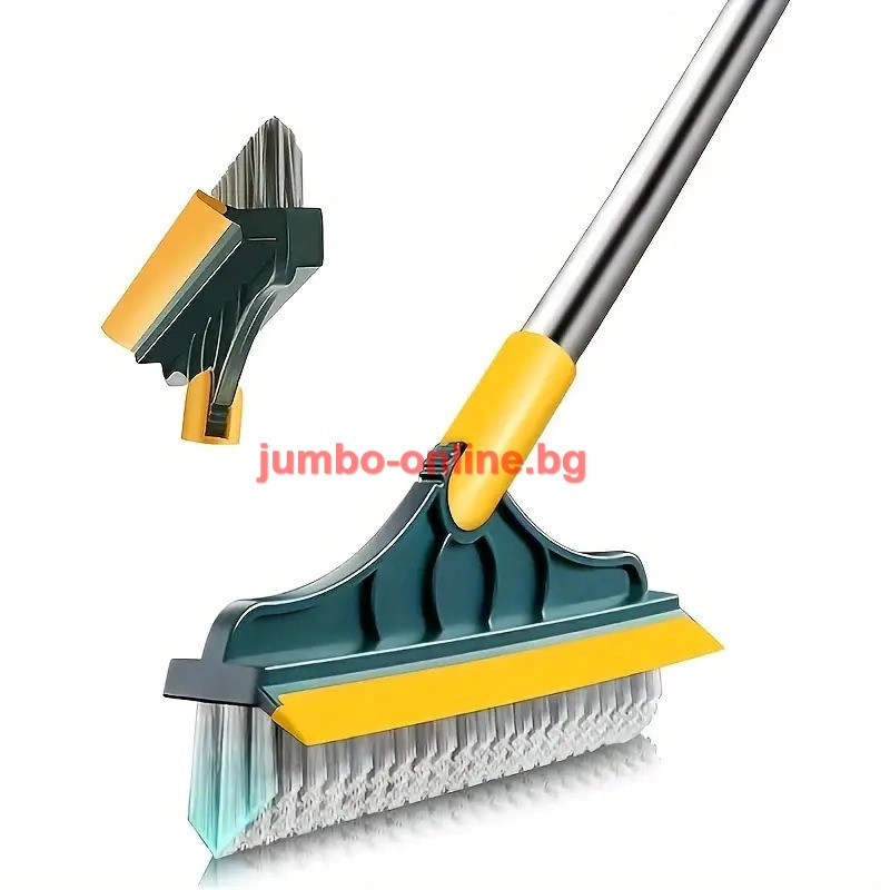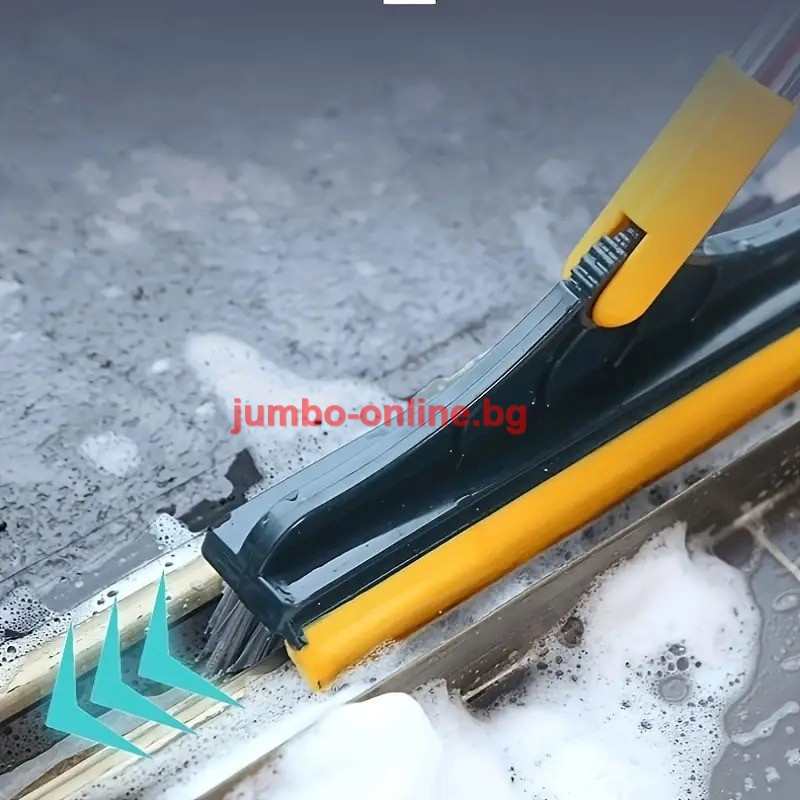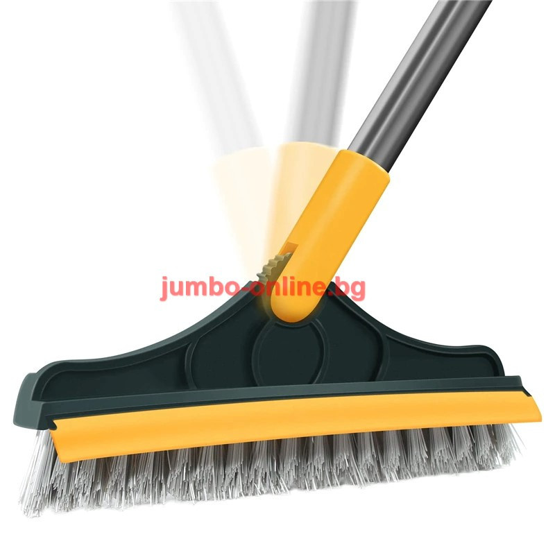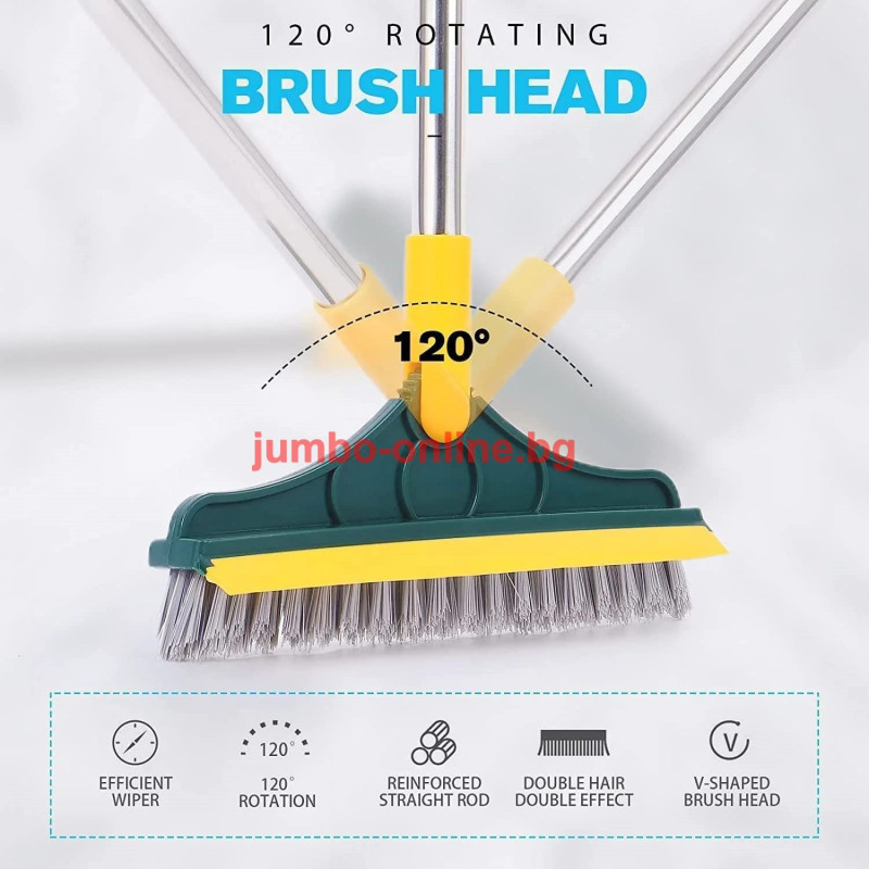 Четката разполага с твърди влакна за интензивно почистване и гумен стъргал за бързо и ефективно премахване на вода и замърсявания. Подвижната глава позволява гъвкавост при почистването на различни повърхности – от плочки и стъкло до дървени подове и плотове. Тази многофункционална четка осигурява цялостно почистване без нужда от допълнителни инструменти.