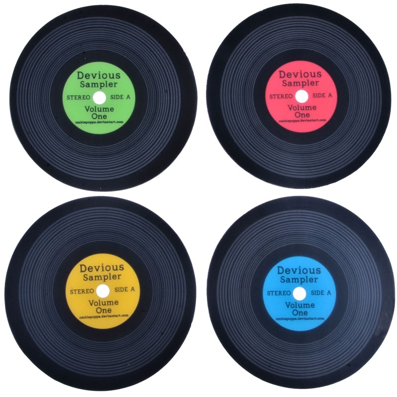 Комплект от 4 броя подложки за чаши, изработени от висококачествена пластмаса във формата на грамофонни плочи в различен цвят - зелен, червен, жълт и син.