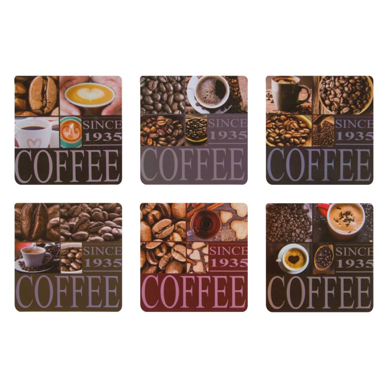 Комплект от 6 броя квадратни подложки за чаши, изработени от висококачествена пластмаса и корк с тематична щампа на чаши и зърна кафе.