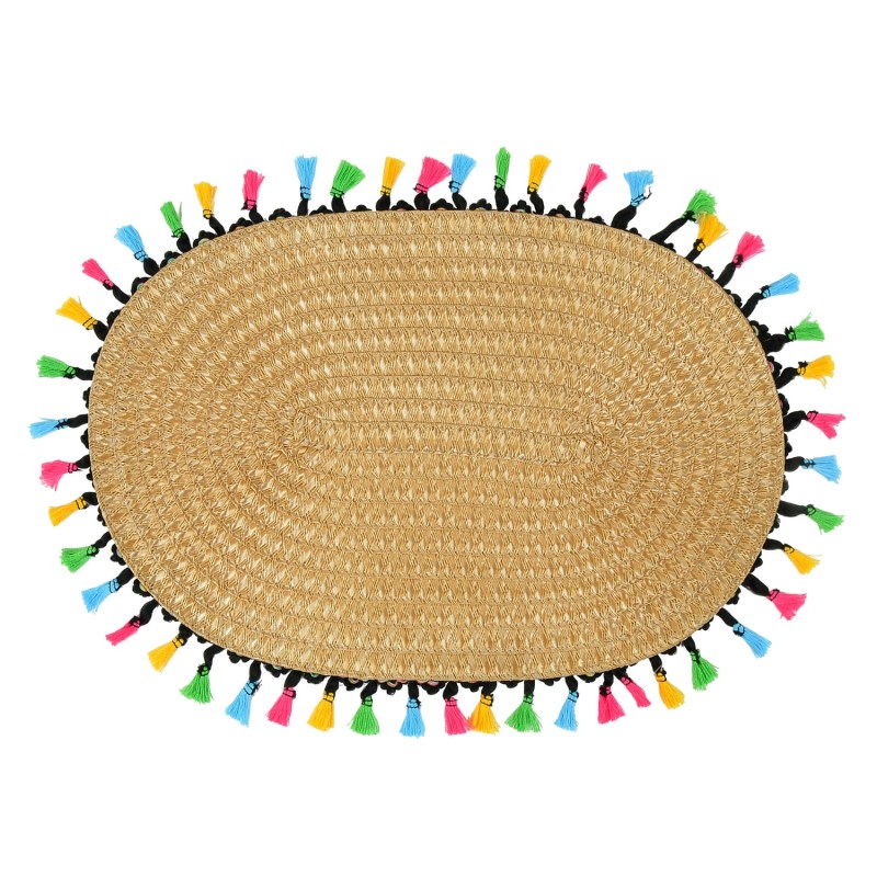 Подложка за хранене с овална форма, изработена от висококачествени материали в бежов цвят с многоцветни пискюли.