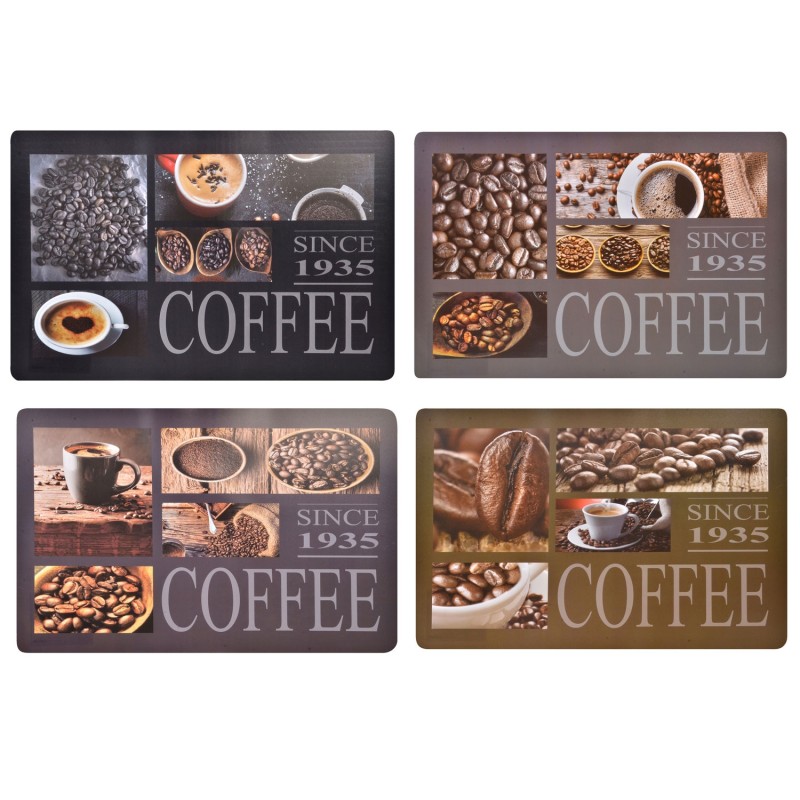Подложка за хранене, изработена от висококачествена пластмаса с тематични изображения на чаши и зърна кафе.