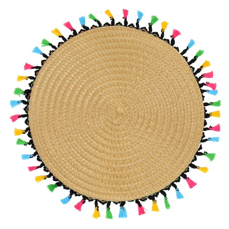 Подложка за хранене с кръгла форма, изработена от висококачествени материали в бежов цвят с многоцветни пискюли.