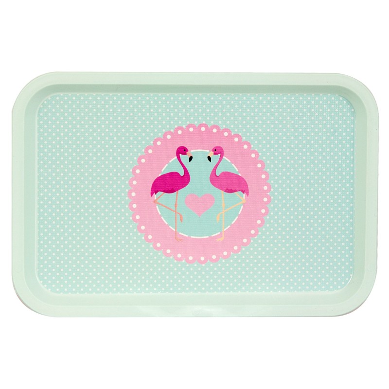 Правоъгълна табла за сервиране, изработена от висококачествена пластмаса в резедав цвят с нехлъзгащо покритие и ефектна щампа на розово фламинго.