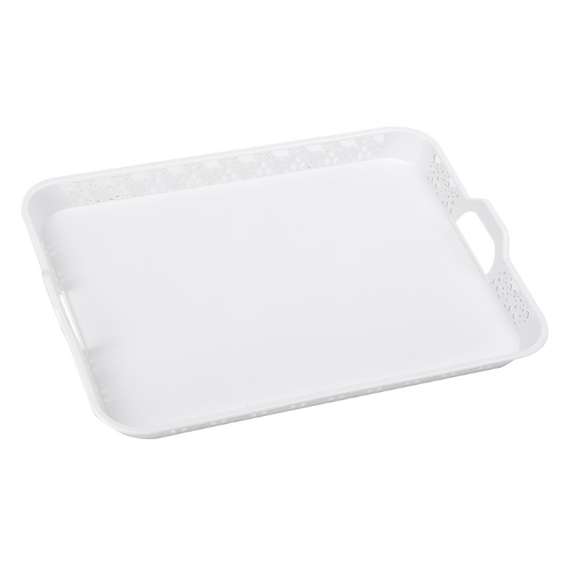 Поднос за сервиране с правоъгълна форма, изработен от висококачествена пластмаса в бял цвят с нехлъзгащо покритие, удобни дръжки и красив рамка, имитираща дантела.