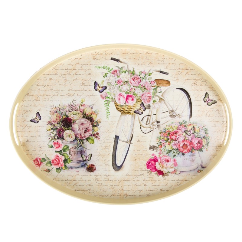 Табла за сервиране с елипсовидна форма, изработена от висококачествена пластмаса в цвят екрю с нехлъзгащо покритие, удобни дръжки и винтидж щампа на велосипед, цветя и пеперуди.