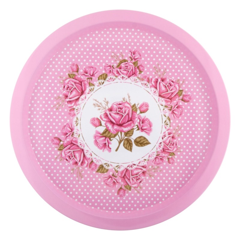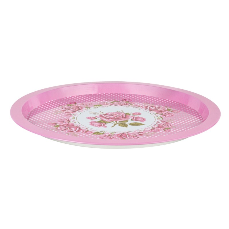 Кръгъл поднос за сервиране, изработен от неръждаема стомана в розов цвят с красив принт на рози.