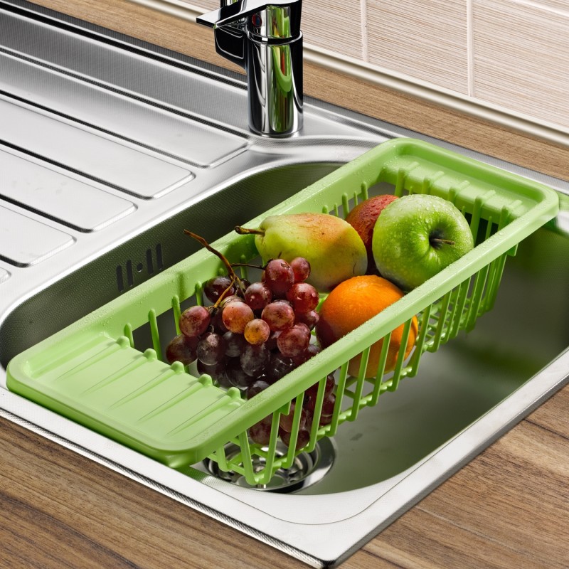 Практичен пластмасов сушилник за съдове и прибори за хранене в зелен цвят. Разполага с отделения за чаши, чинии и страничен плот за вилици, лъжици и ножове.