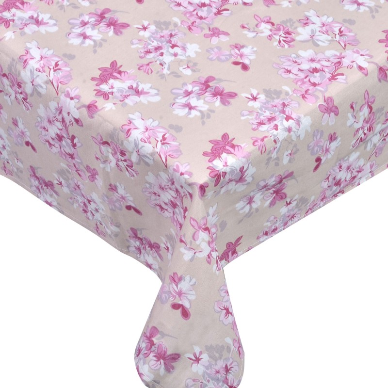 Квадратна покривка за маса, изработена от висококачествена материя в бежов цвят с красив флорален принт в лилави нюанси.