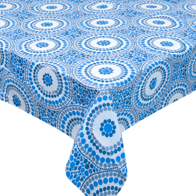 Мушама за маса за еднократна употреба, изработена от пластмаса с принт на красива синя мозайка.