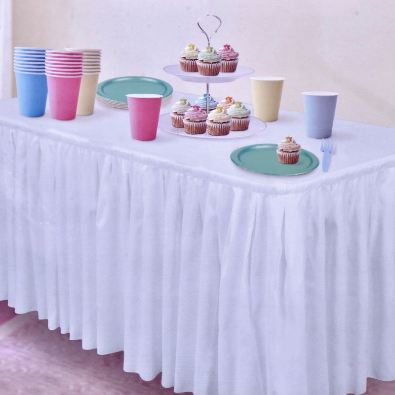 Покривка за маса за еднократна употреба, изработена от олекотена пластмаса в бял цвят.