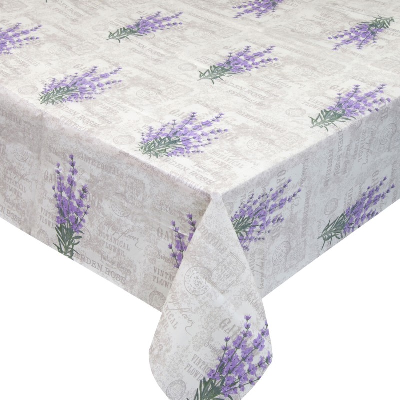 Мушама за маса за еднократна употреба, изработена от пластмаса в сив цвят с красив флорален принт на лавандула.