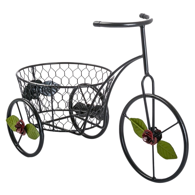 Поставка за саксия във формата на велосипед, изработена от висококачествена метална сплав в черен цвят с декоративни зелени листа и червени рози.