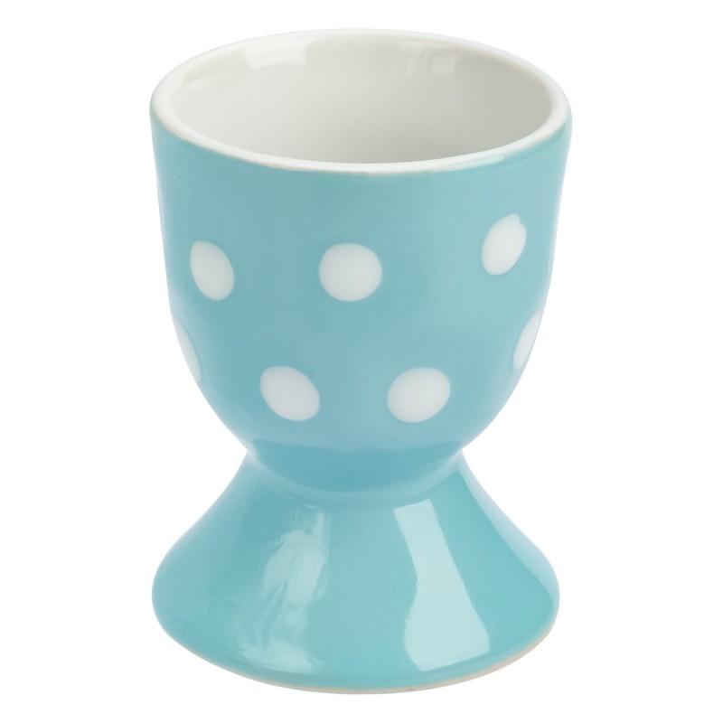 Единична поставка за сервиране на яйце, изработена от висококачествена керамика в светло син цвят на бели точки.