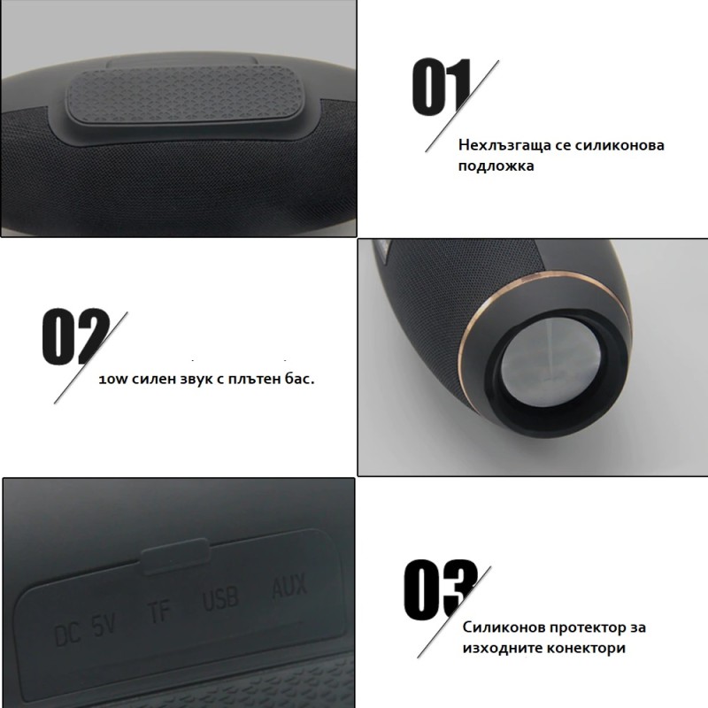 Колонката има силен звук с добро качество. С нея може да слушате безжично музика от Вашия телефон или друго устройство в продължение на до 6 часа.