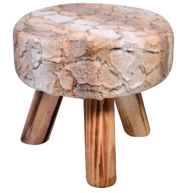 Удобно ниско трикрако столче в кръгла форма, изработено от дърво с меко и пухкаво покритие от полиестер, имитиращо леопардов принт.