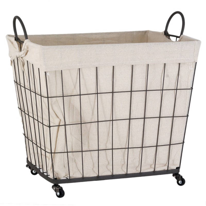 Правоъгълна кошница за пренасяне и съхранение на дърва за камина, изработена от метал с подплата от синтетичен платв бежов цвят, удобни дръжки и колелца за лесно придвижване.