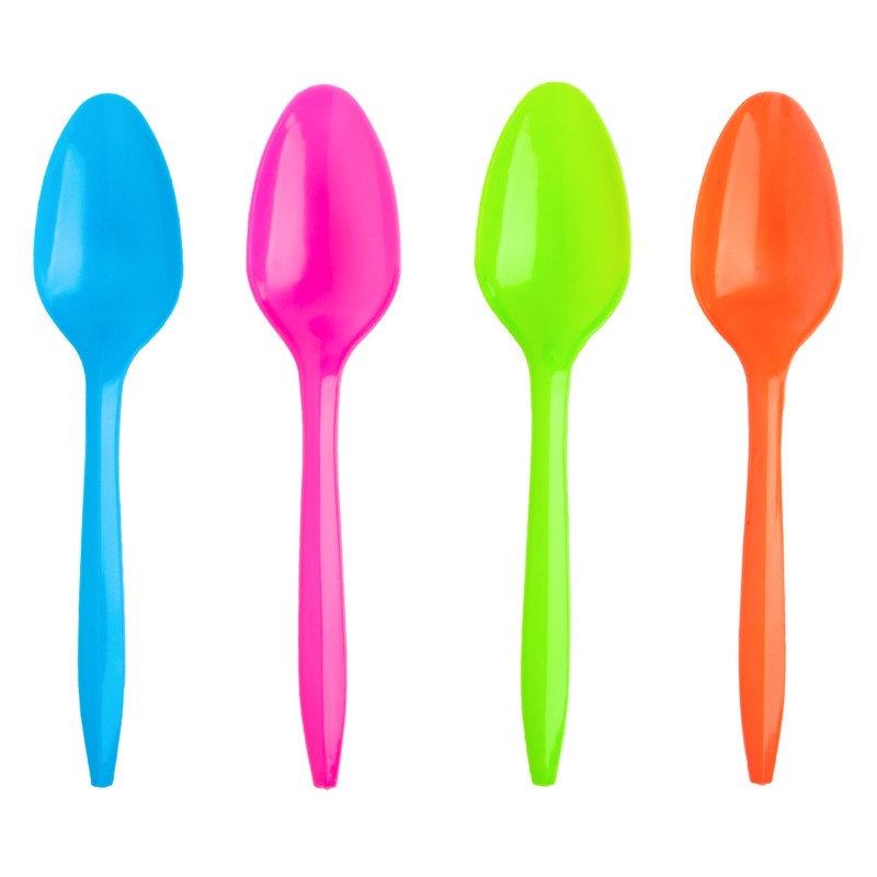 36 броя лъжици за еднократна употреба, изработени от плътна пластмаса в различни неонови цветове - син, цикламен, зелен и оранжев.