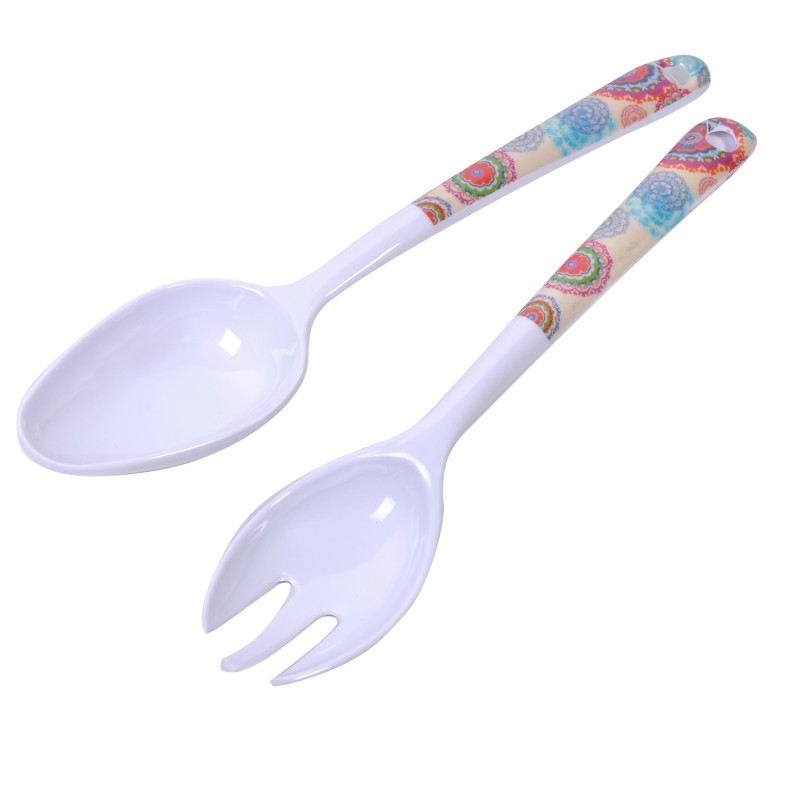 Комплект прибори за хранене вилица и лъжица, изработени от меламин с многоцветен флорален принт.