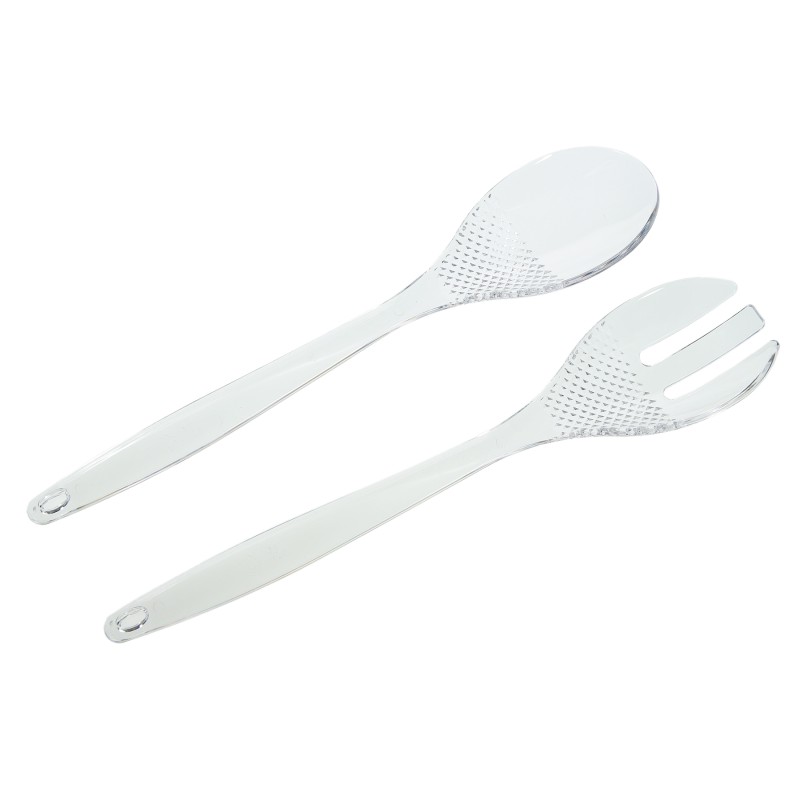 Комплект прибори за хранене - вилица и лъжица, изработени от устойчива прозрачна пластмаса.