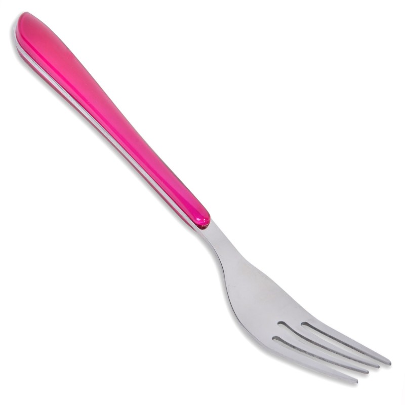 Вилица за основно ястие, изработена от висококачествена неръждаема стомана в сребрист цвят с пластмасова дръжка в цикламен цвят.