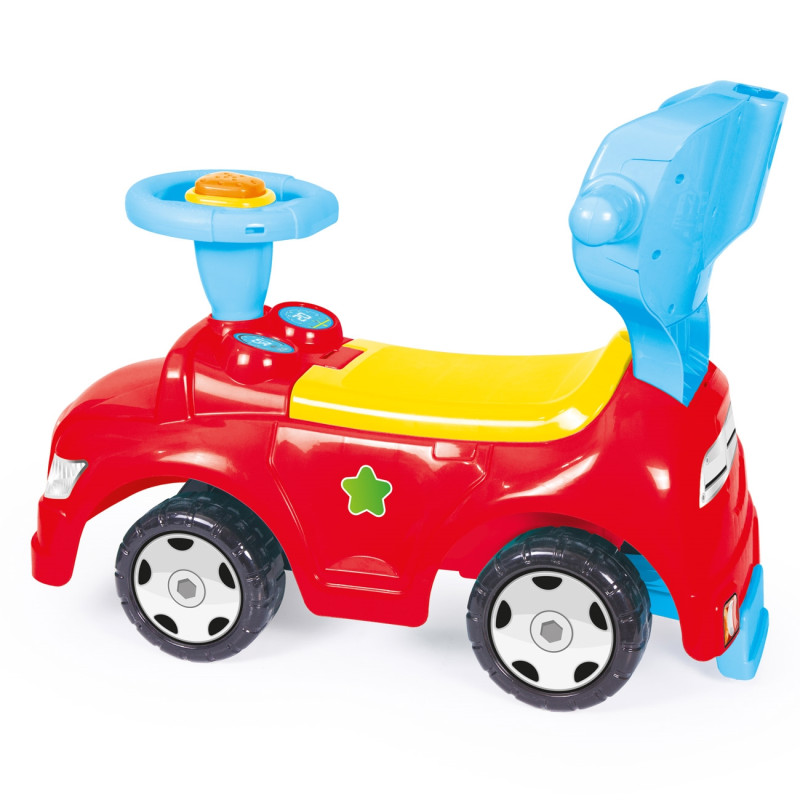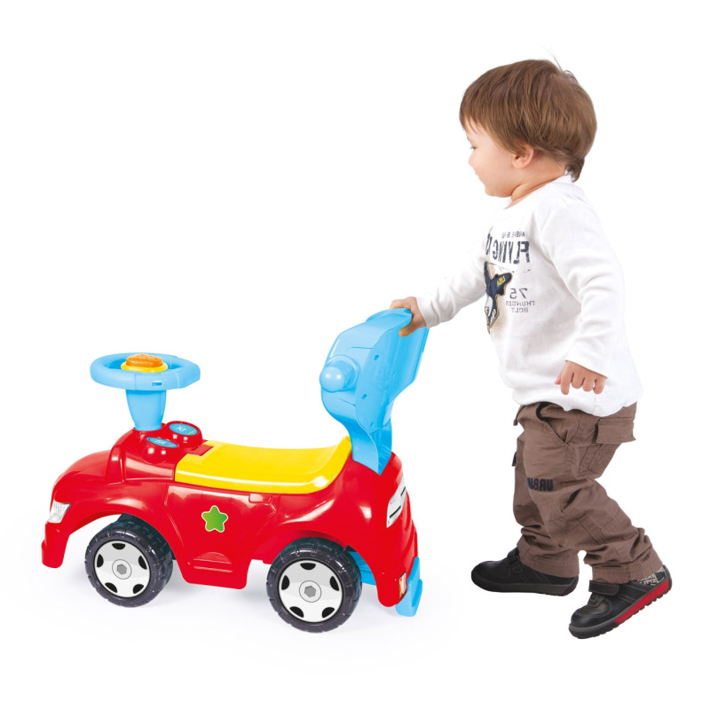 Детска кола в червен цвят за бутане и яздене с подвижна родителска дръжка и свирка на волана и звуци.