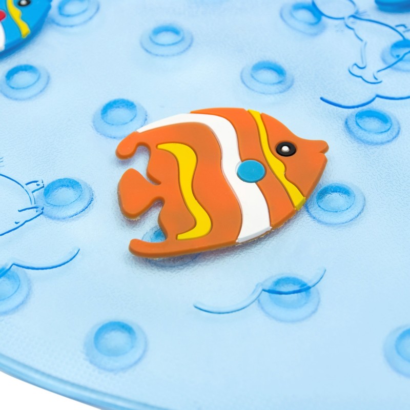 Детска постелка за баня, изработена от висококачествена пластмаса с противохлъзгащо покритие и красива щампа на сини и оранжеви рибки.