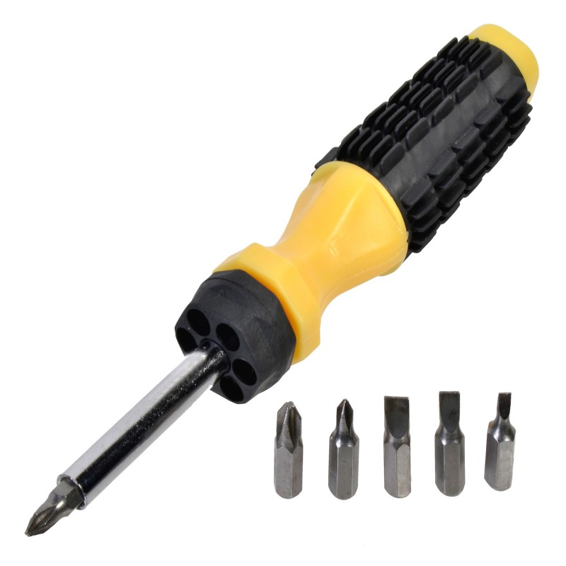 Комплект от отвертка с 5 сменяеми магнитни кръстати и плоски накрайника за универсална употреба.