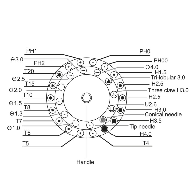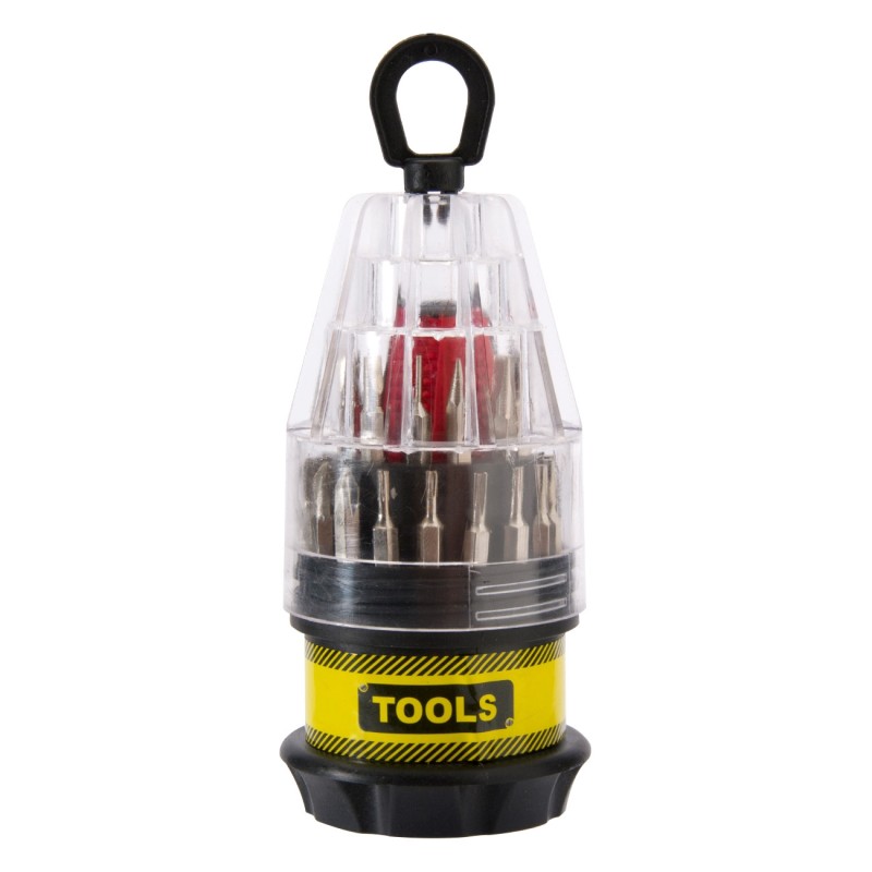 Професионален комплект от магнитна отвертка с 31 сменяеми накрайника с различна форма и размери, трикомпонентна дръжка и практична пластмасова кутия за удобно съхранение.