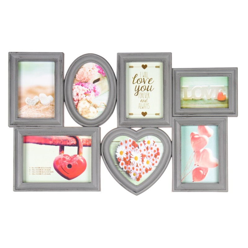Стилна рамка за 7 снимки, изработена от качествена и олекотена пластмаса в сив цвят с различна форма - правоъгълна, овална и сърце.