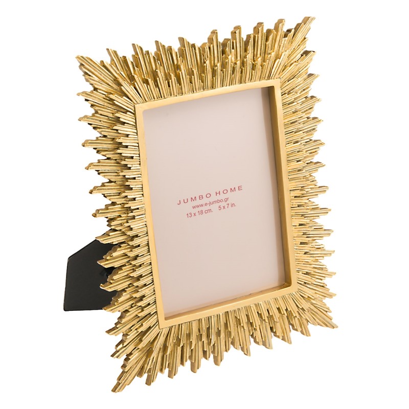 Декоративна рамка за снимка със стойка, изработена от полирезин с релефни златисти лъчи и плексиглас.