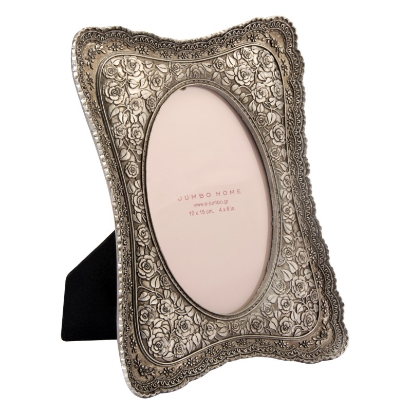 Декоративна рамка за снимка със стойка, изработена от полирезин в сребрист цвят с релефни рози и прозрачен плексиглас.