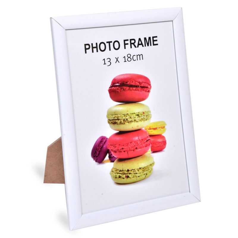 Класическа рамка за снимка със стойка, изработена от качествена и олекотена пластмаса в бял цвят и стъкло.