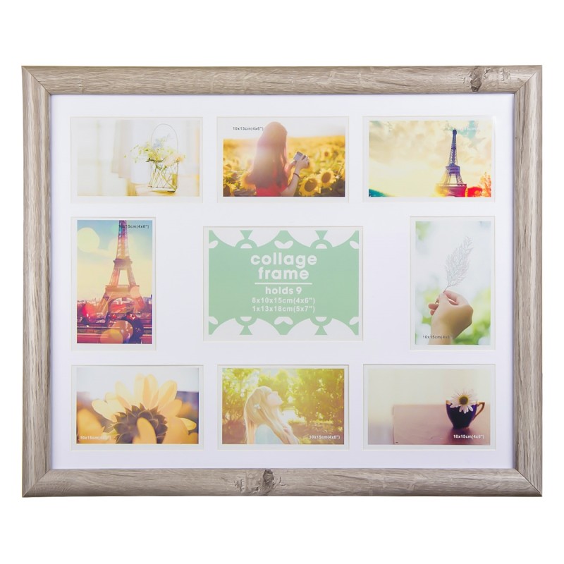 Колажна рамка за 9 снимки, изработена от качествена дървесина в сив цвят и стъкло.