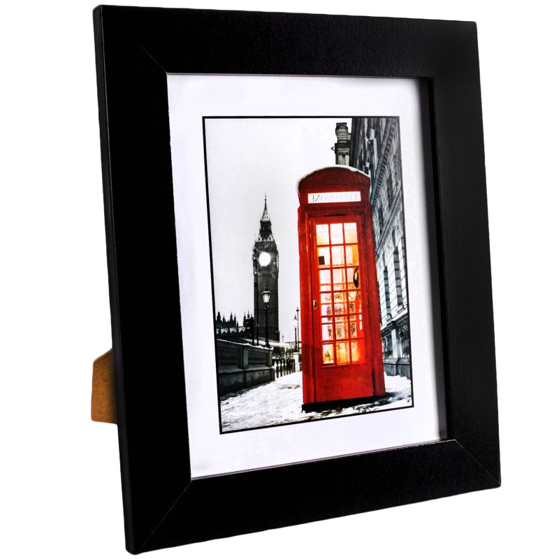 Класическа рамка за снимка със стойка, изработена от олекотена пластмаса в черен цвят и стъкло.