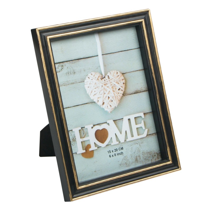 Класическа рамка за снимка със стойка, изработена от качествена пластмаса в черен цвят със златисти акценти и стъкло.