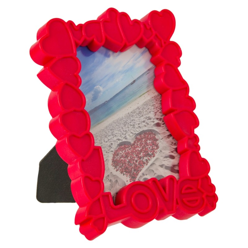 Уникална рамка за снимка със стойка, изработена от качествена и олекотена пластмаса във формата на червени сърца с надпис LOVE и стъкло.