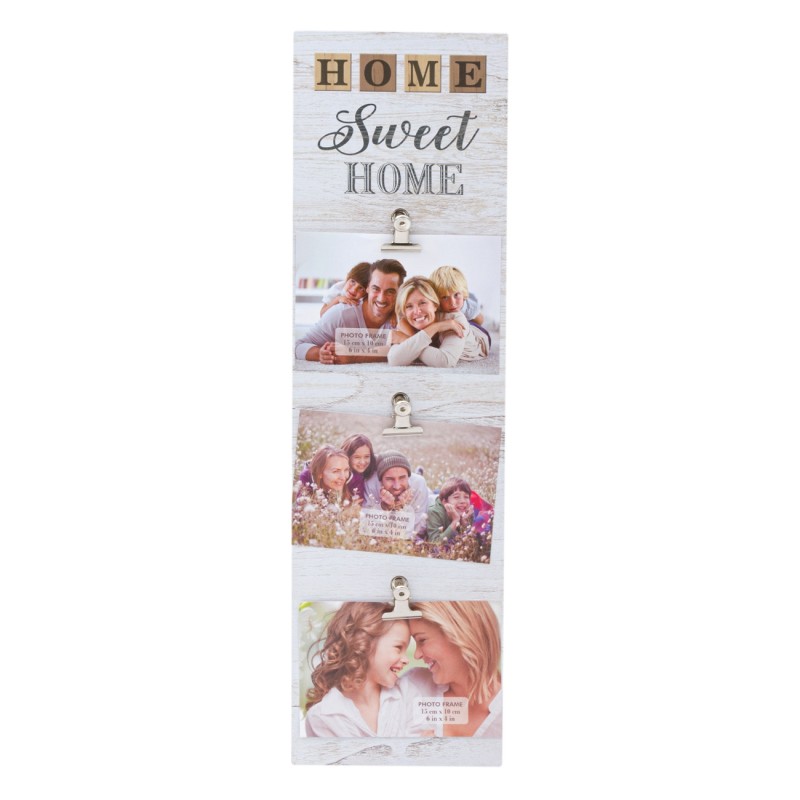 Модерна фоторамка, изработена от качествена дървесина в бял цвят с 3 броя метални клипсове в сребрист цвят.