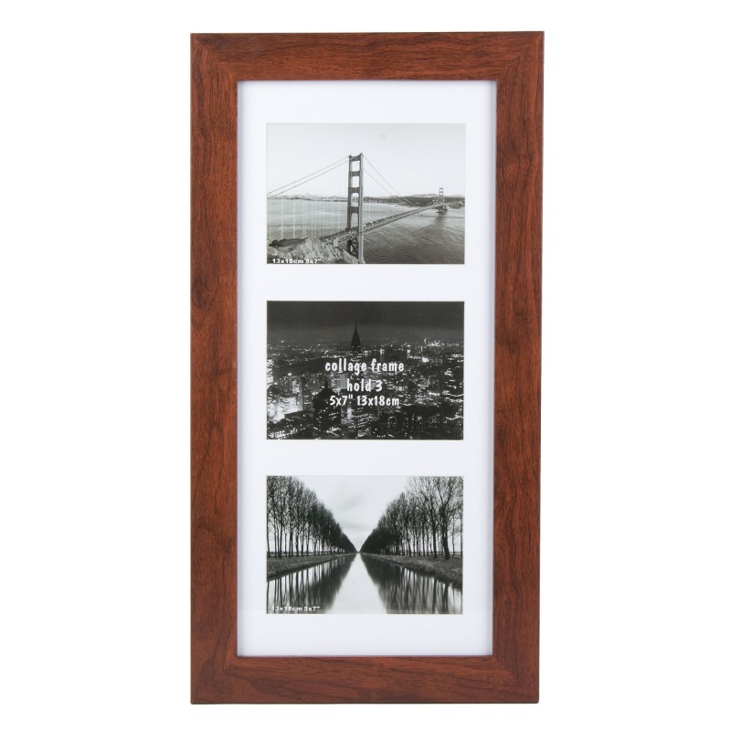 Класическа рамка за 3 снимки, изработена от качествена дървесина в тъмно кафяв цвят и стъкло.