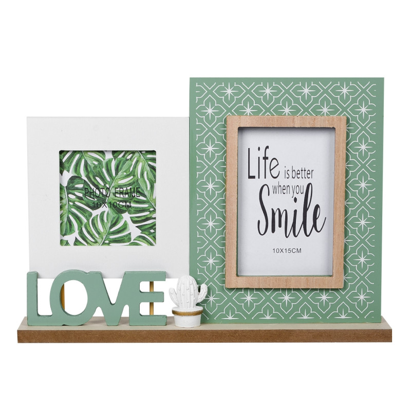 Ефектна рамка за 2 снимки със стойка, изработена от качествена дървесина в бяло и зелено с надпис LOVE и декоративен кактус.