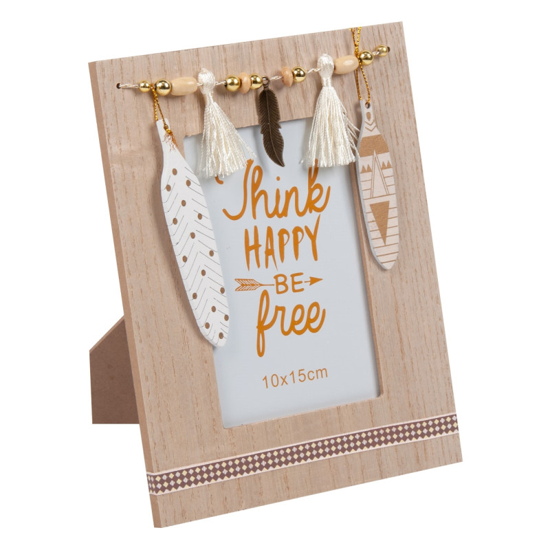 Рамка за снимка със стойка, изработена от качествена дървесина в бежов цвят с декоративни мъниста, пискюли и пера.