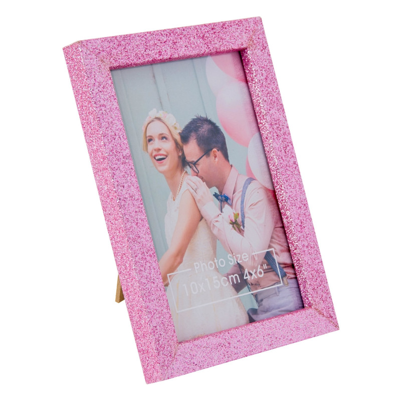 Декоративна рамка за снимка със стойка, изработена от висококачествена дървесина в розов цвят с блестящи частици и стъкло.